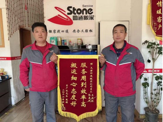 搬家结束后,狄先生对两位员工的服务赞不绝口,特意定制锦旗送到四通搬家天津公司,以此表达对张来风、王连振两位员工的感谢,也对四通搬家规范化的服务流程和员工的敬业精神给予了高度评价。“原本以为搬家又累又繁琐,没想到四通的员工这么专业贴心,不仅效率高,还特别细心,把我的东西当成自己的一样爱护,选择四通真是选对了!”狄先生的真诚夸赞,是对两位员工服务的最好褒奖,更是对四通搬家服务理念的践行认可。